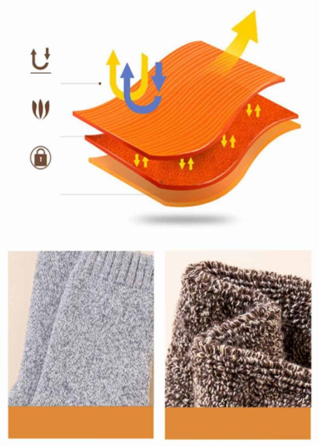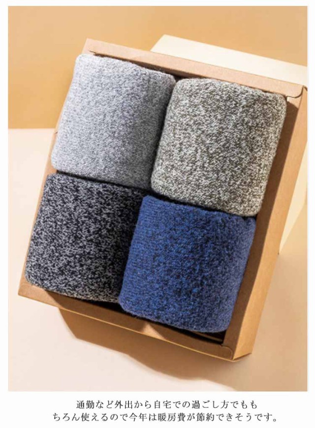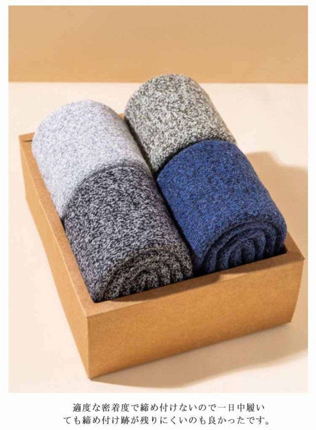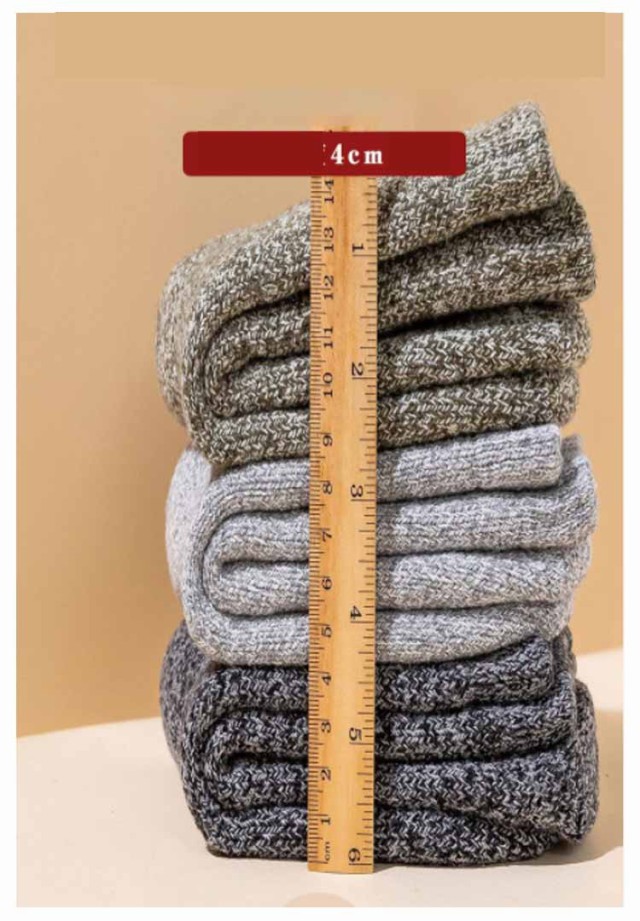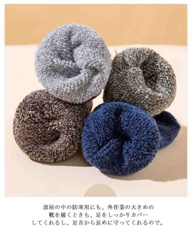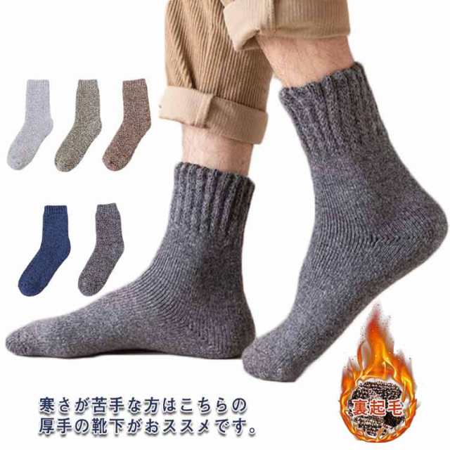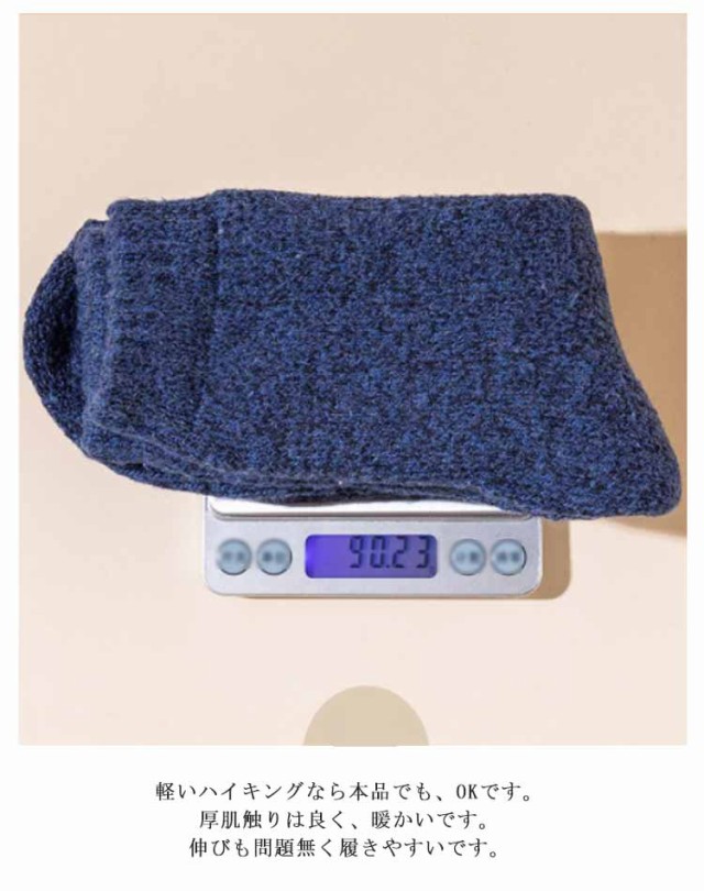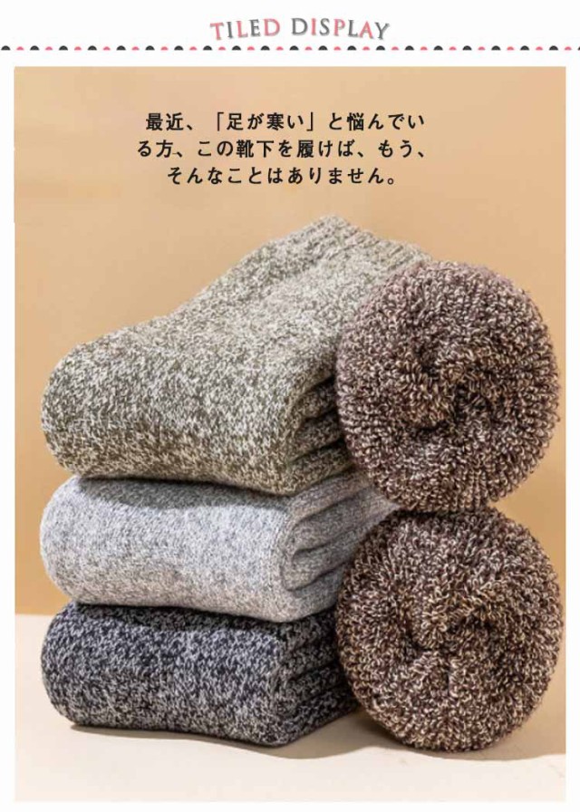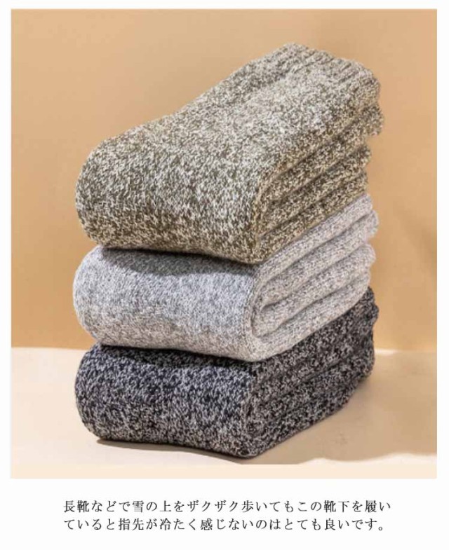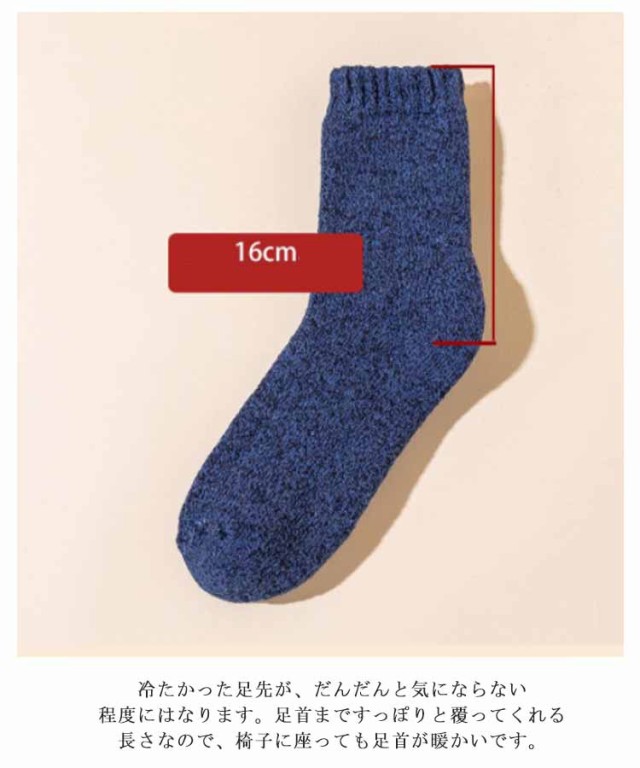 | 寒さが苦手な方はこちらの厚手の靴下がおススメです。最近、「足が寒い」と悩んでいる方、この靴下を履けば、もう、そんなことはありません。暖房を入れるほどでも無い室温でも、足元は意外と冷たくなるものです。そんなときに役に立ちます。冷たかった足先が、だんだんと気にならない程度にはなります。足首まですっぽりと覆ってくれる長さなので、椅子に座っても足首が暖かいです。通勤など外出から自宅での過ごし方でももちろん使えるので今年は暖房費が節約できそうです。 北国の冬の寒さに耐えられる厚さのソックスです。部屋の中の防寒用にも、外作業の大きめの靴を履くときも、足をしっかりカバーしてくれるし、足首から長めに守ってくれるので。長靴などで雪の上をザクザク歩いてもこの靴下を履いていると指先が冷たく感じないのはとても良いです。適度な密着度で締め付けないので一日中履いても締め付け跡が残りにくいのも良かったです。軽いハイキングなら本品でも、OKです。厚肌触りは良く、暖かいです。伸びも問題無く履きやすいです。 | |