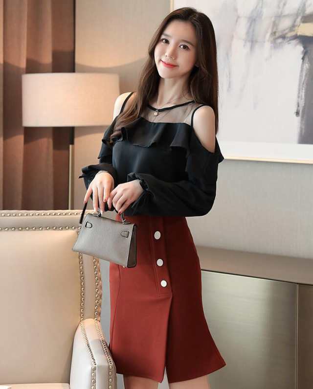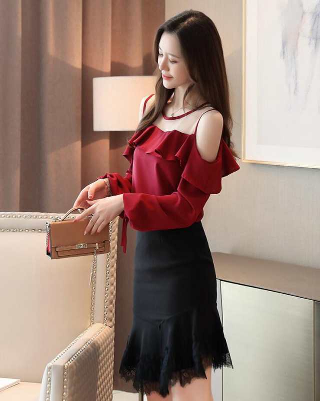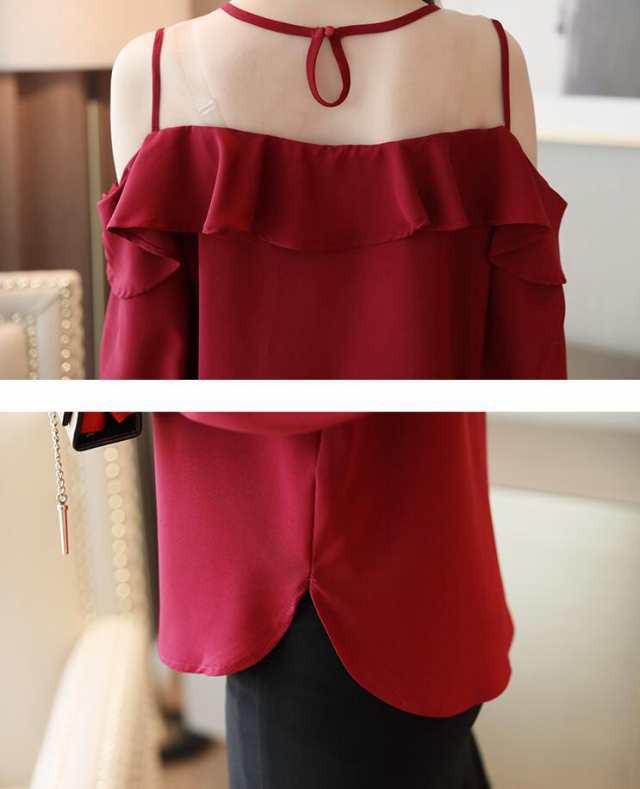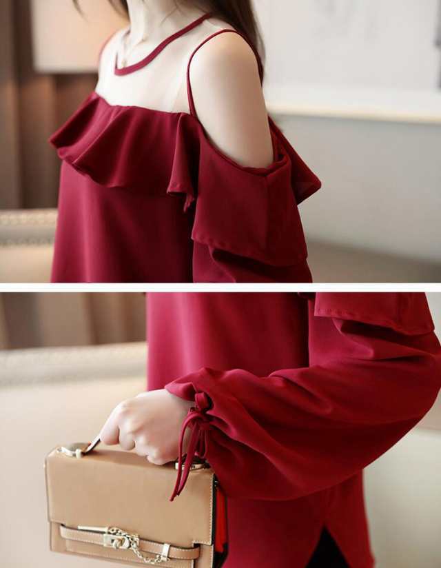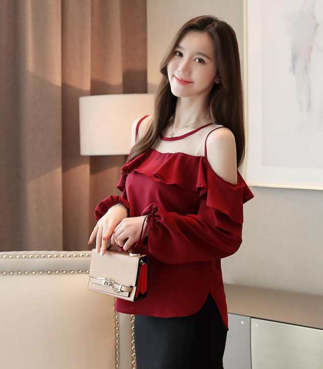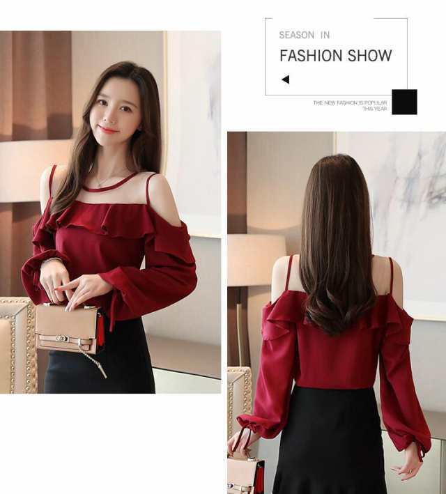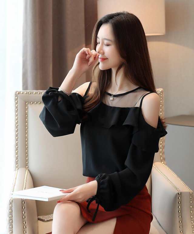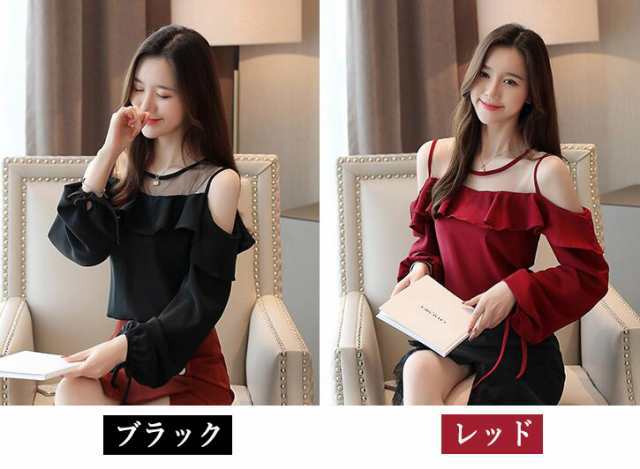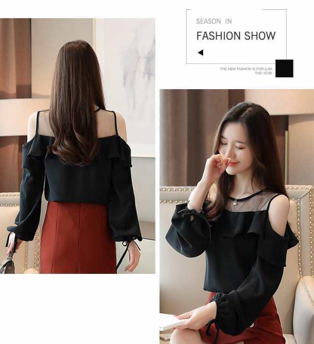 シフォンブラウスフリル肩出しオープンショルダーシフォンブラウスシースルー切り替えフリル透けセクシーきれいめ ゆったり春秋長袖レデ