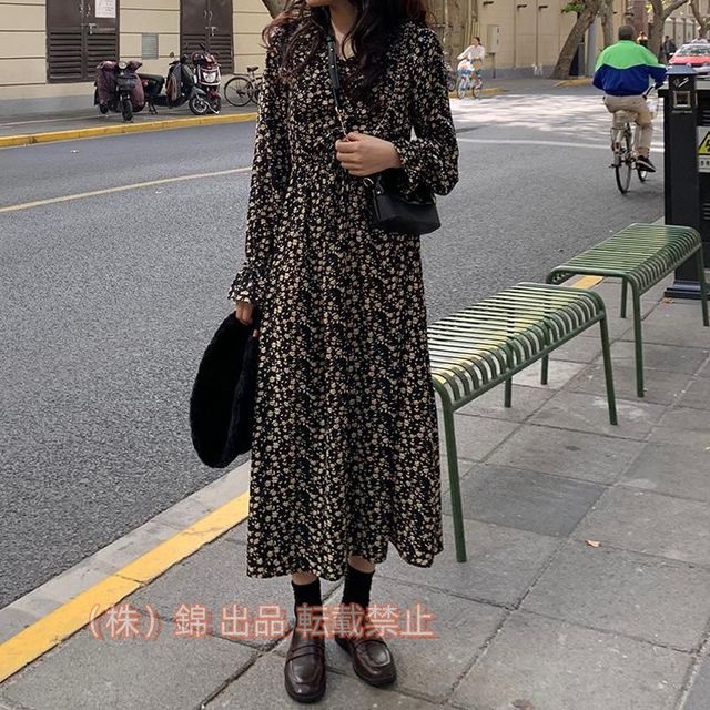 ワンピース 秋物 レディース 40代 きれいめ 秋 ロングワンピース 春新作 錦 長袖 花柄ワンピース シフォン フレアスカート オシャレ 通勤 結婚式お出かけ 大人