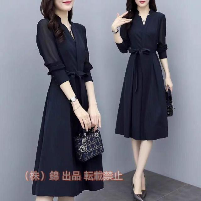 ワンピース長袖春秋きれいめレディースお出かけAライン膝丈フェミニンパーティドレスお洒落女の子優雅錦大人切り替え体型カバー大人デート着や