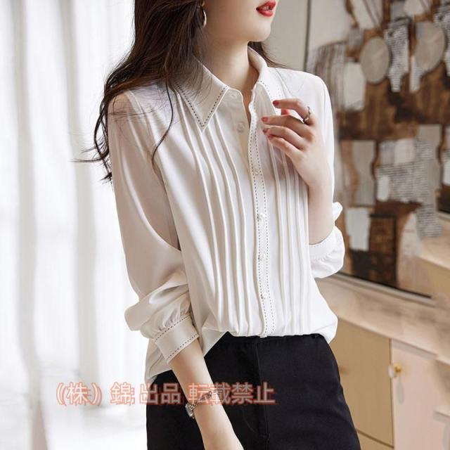 連携キーワード:ブラウス レディース 長袖ブラウス 秋冬 オフィスブラウス 白プリーツ オシャレブラウス 折り襟トップス 韓国風 大人 通勤OL ゆったりシャツ 40代 30代 50代