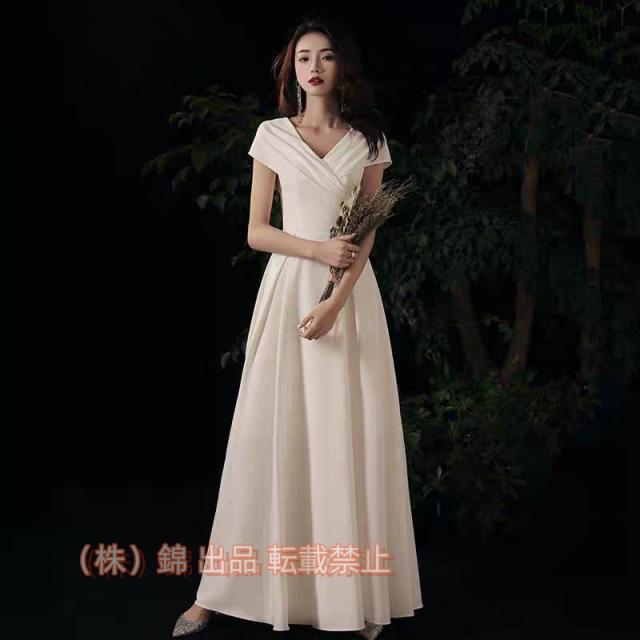 ウェディングドレス結婚式二次会花嫁ドレス白ワンピース大きいサイズ披露宴ロングドレス袖ありvネック錦ハイウエスト上品エレガントエンパイアライン無地