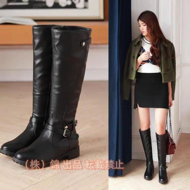 防滑ストレッチロングブーツストレッチロングブーツジョッキーブーツレザー調ブーツスムースブラック黒レディース靴株式会社錦歩きやすい痛くないブーツ