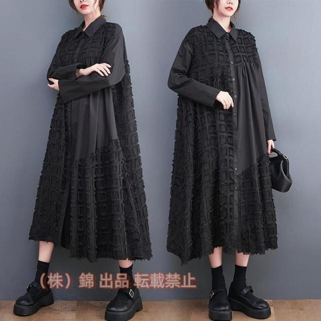 シャツワンピース 長袖 ロング丈 切り替え 前開き レディース 前ボタン留め 折り襟 ゆったりシルエット 大人のこなれ感漂う 株式会社錦今っぽくお洒落にキマる