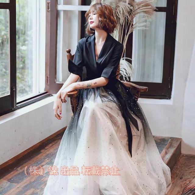 カラードレス カクテルドレス ブラック 黒 Vネック ロングドレス パーティードレス 発表会 演奏会 イブニングドレス フォマール錦 大人 切替 ファッション