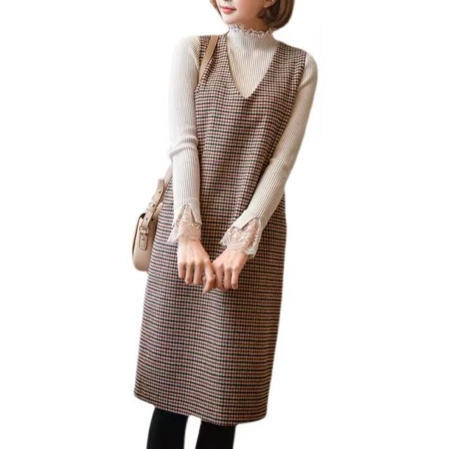 チェックジャンバースカート 千鳥格子 V襟 可愛い ひざ下丈 上品 大きいサイズ有り 株式会社錦Sから5L ほっそり効果大通勤通学20代30代40代50代60代