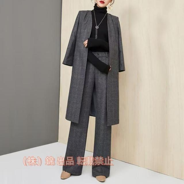 レディースセットアップフォーマルパンツドレス2点セット長袖上下セットチェック柄パンツスーツキレイめ着痩せ秋冬株式会社錦入園式卒業式セレモニー