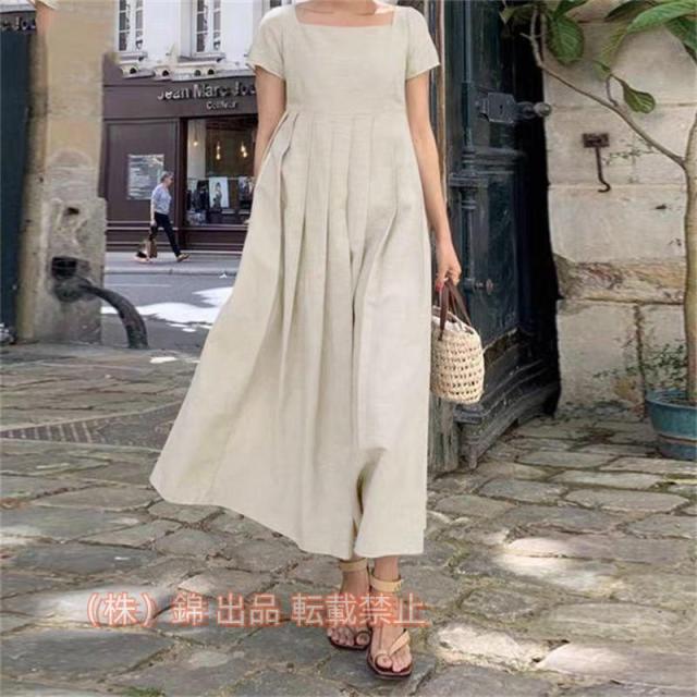 ハイウエストプリーツワンピース ミモレ丈 半袖 スクエアカット袖 大きいサイズあり 株式会社錦Sから3L 女子会細く見える通勤通学20代30代40代50代60代