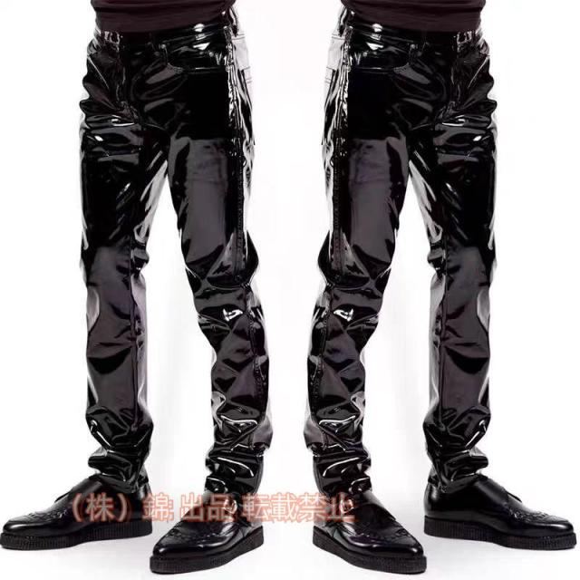 レザーパンツ エナメル ジッパー付 メンズ ロングパンツ セクシー フェイクレザーパンツ株式会社錦 黒 スキニー ライダース スリム 細身 革パン