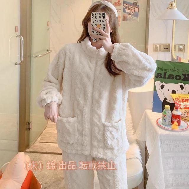 パジャマ モコモコルームウェア レディース 冬 長袖パジャマ 前開き 可愛い無地 フランネルルームウェア 株式会社錦暖かい上下セット 厚手 部屋着