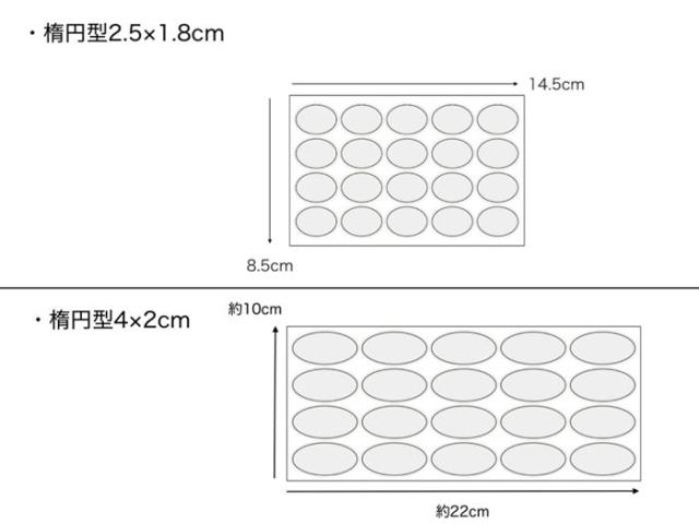 | サイズ | 円型:2cm・200枚 円型:3cm・100枚 円型:4cm・80枚 円型:5cm・50枚 楕円:2.5cm×1.8cm・200枚 楕円:4cm×2cm・100枚 |