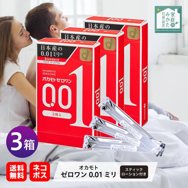 コンドーム オカモトゼロワン 0.01ミリ 中身がバレない包装コンドーム 3個入り 3個セット 単品 ポリウレタン PU スティックローション付き 日本製 コンドーム こんどーむ 避妊具 スキン 送料無料 薄い うすい condom