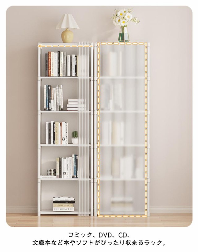 | 【6段?2連】【大容量収納】【本棚】【扉付き】 コミック、DVD、CD、文庫本など本やソフトがぴったり収まるラック。 本棚や飾り棚、小物の整理棚など、様々な使い方ができるシンプルなラック。 大量収納なのに、探しやすく、取り出ししやすい構造です。 シンプルな形が部屋に優しい雰囲気をもたらしてくれ、お宅や職場など、あらゆるシーンで末永く長くご愛用いただけるアイテムです。 生活用品、おもちゃ、雑誌、お子さん用の絵本などを一箇所に集め、スペースをとらずに収納できるので、一人暮らしやワンルームの部屋に住んでいる方にもお勧めです。 防水で汚れにくく、水に濡れてもさっと拭き取ることができ、お手入れは超楽になります。たっぷりな収納スペースをご利用頂けます。 | |