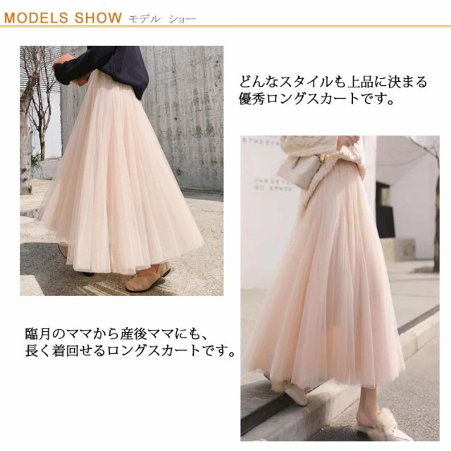 | マタニティ用、三重チュールスカートはこれ一枚で一気にお洒落にみせてくれます。 大きなお腹もすっぽり楽に包み込み、ウエストもぐんぐん伸びるゴム仕様でアジャスターで調整できるので、お腹が大きくない妊娠初期から産後まで長くお使いいただけるアイテムです。 シャツやパーカーなどトップスに合わせるは相性抜群。 気になるヒップや足のラインが響きにくいのも魅力のひとつ。 どんなスタイルも上品に決まる優秀ロングスカートです。 臨月のママから産後ママにも、長く着回せるロングスカートです。 | |