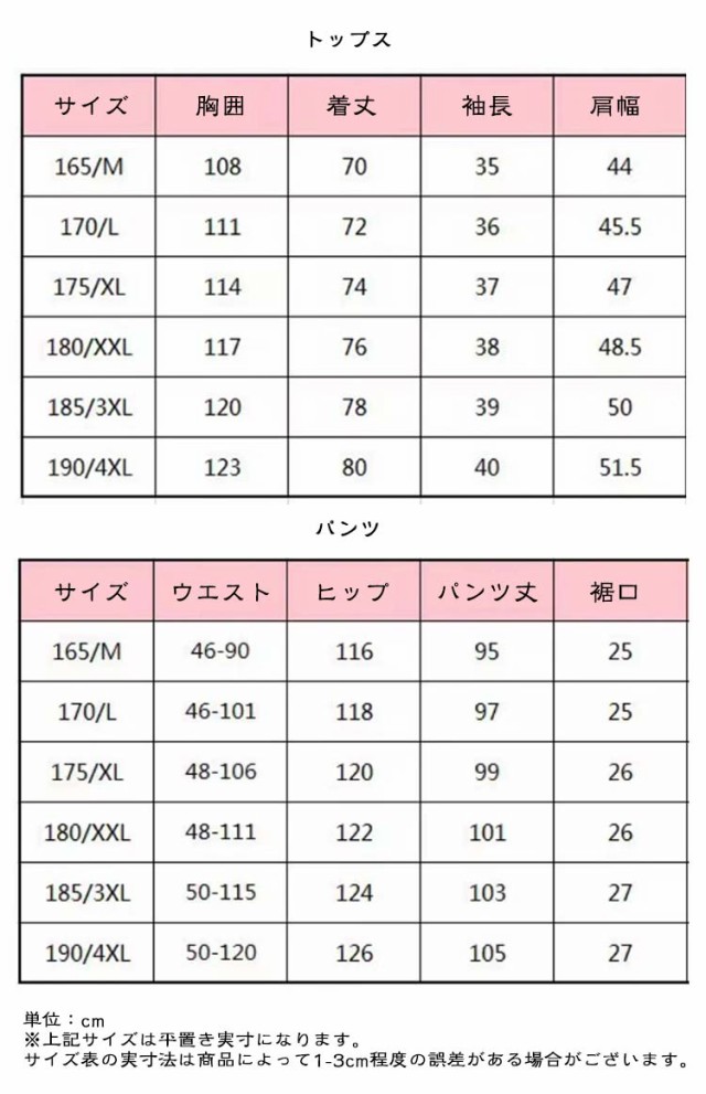 | サイズ | M(上下セット) L(上下セット) XL(上下セット) 2XL(上下セット) 3XL(上下セット) 4XL(上下セット) 5XL(上下セット) |