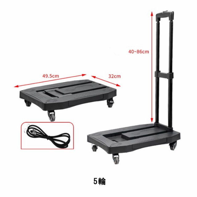 | サイズについての説明 | サイズ:4輪:荷台:43.5*31cm 高さ約40-86cm 耐荷重:75KG 重量:2KG 5輪:荷台:49.5*32cm 展開時:54.2*42cm 高さ約40-86cm 耐荷重:100KG 重量:2.5KG |