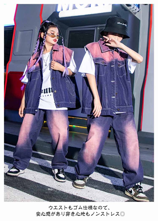 キッズ ダンス衣装 ヒップホップ 紫 デニム ベスト ロングパンツ 絞り染め セットアップ 男の子 女の子 ジャズダンス 袖なし デニムシャツ 長ズボン 2点セット 子供 ジュニア かっこいい ゆったり 団体服 応援団 イベント 発表会 文化祭 演出服 体育祭 120-180cm