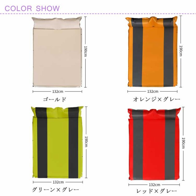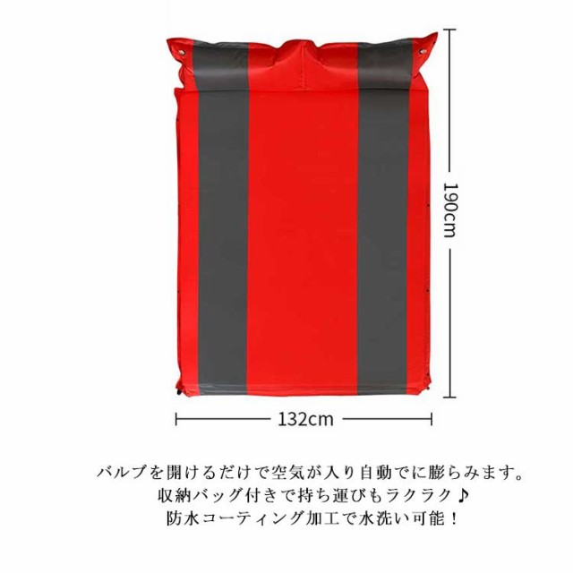| 収納もコンパクト2人用キャンピングマット! 厚さ2.5cmもあるため快適に過ごすことができます。 テント泊をする時の湿気や暑気をカットできます。 連結可能なので二人や家族でゆったり過ごせます。 頭部を高反発フォームで支え、しっかりフィット。個人習慣によってエアーピローの膨張程度を調整でき、均一的にストレスを分散し、体とぴったり合うので、血管、神経に圧迫されなく、頚椎の疲労を解消して快適に眠りに付けます。 バルブを開けるだけで空気が入り自動でに膨らみます。 収納バッグ付きで持ち運びもラクラク? 防水コーティング加工で水洗い可能! 汚れてもサッと拭き取りお手入れはらくらく! 釣り、車中泊、山登り、バーベキュー、公園、坪、キャンプ、砂浜などのさまざまなアウトドアシーンで使えます。 2人用テントや2人用?3人用寝袋と合わせて利用でき、仕事場での昼休み、仮眠用の簡易ベッド、地震や災害時の防災用品としてもおすすめです。 | |
