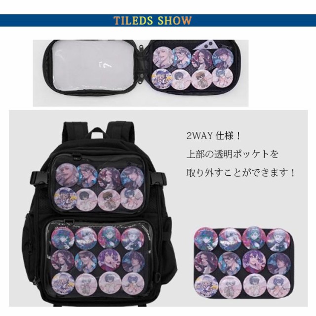 | 痛バッグ2WAY! リュック&ショルダーバッグ 2WAY仕様!上部の透明ポッケトを取り外すことができます!付属のショルダーベルトを使うと、単体でショルダーバッグやウェストバッグとしても使えます。 収納に便利な大容量リュック? 通学バッグとしても使えます。 クリアポッケトはメッシュシート付きなので缶バッジのピンも通しやすく、カニカン付きのチャームをつけるのも簡単! | |