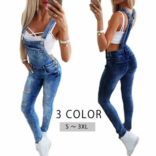 コンビネゾン オールインワン レディース デニムオーバーオール スキニー 大人 スキニー ロングパンツ オーバーオール ジーンズ サロペット デニム ブラック デニム ロンパース つなぎ ダメージ デニム 黒 ブルー お洒落