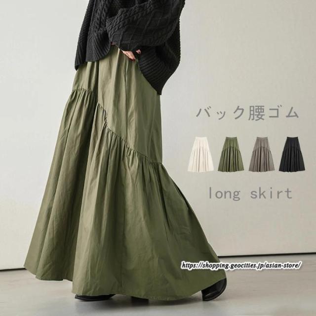 ロングスカート フレアスカート 綿スカート ウエストゴム ハイウエスト ギャザー レディース 秋物 春秋 aラインスカート ワイド 体型カバー 無地大人
