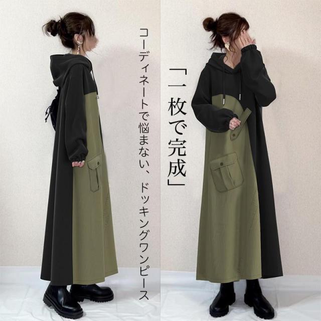 ロングワンピース 秋冬 レディース ドッキングワンピース バイカラー フード付き フレアワンピース aラインワンピース 長袖 30代40代50代 通勤 ワンピース