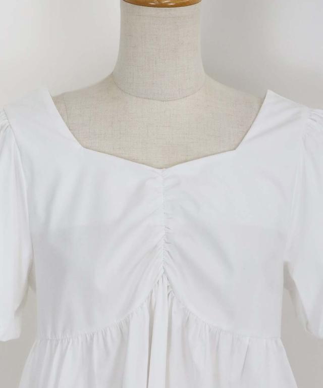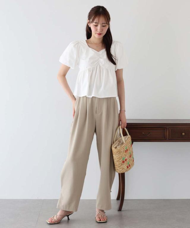 胸元のギャザーのデザインで、シンプルなボトムスでもコーデが一気に華やかになります。