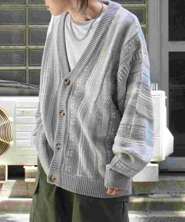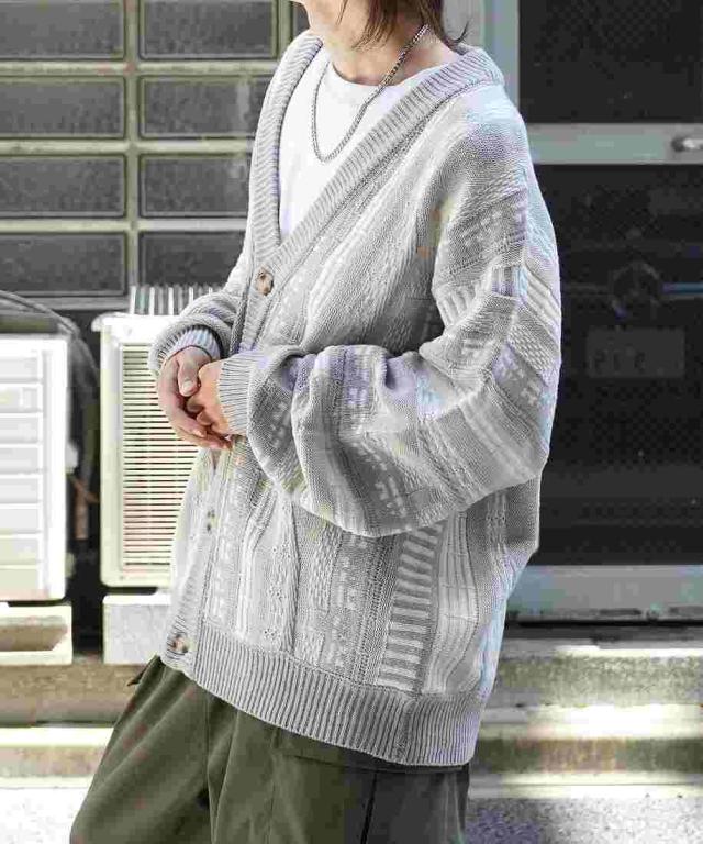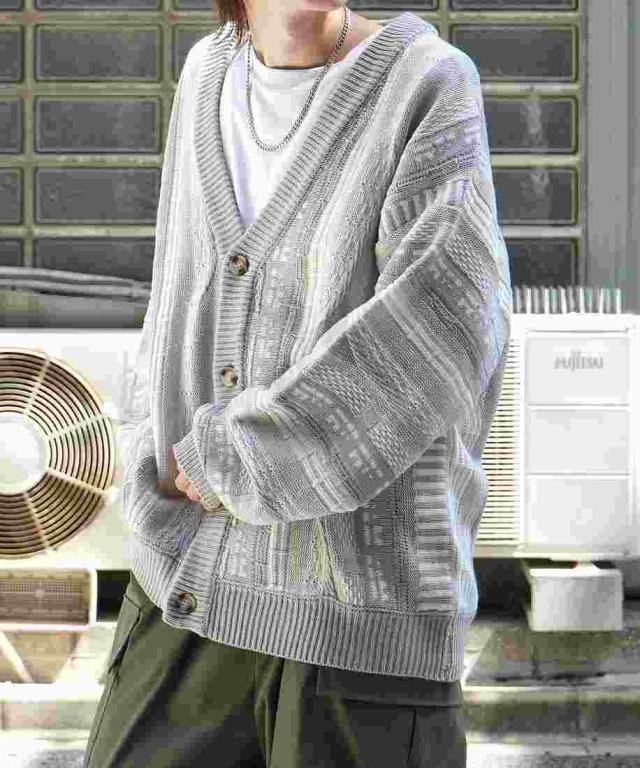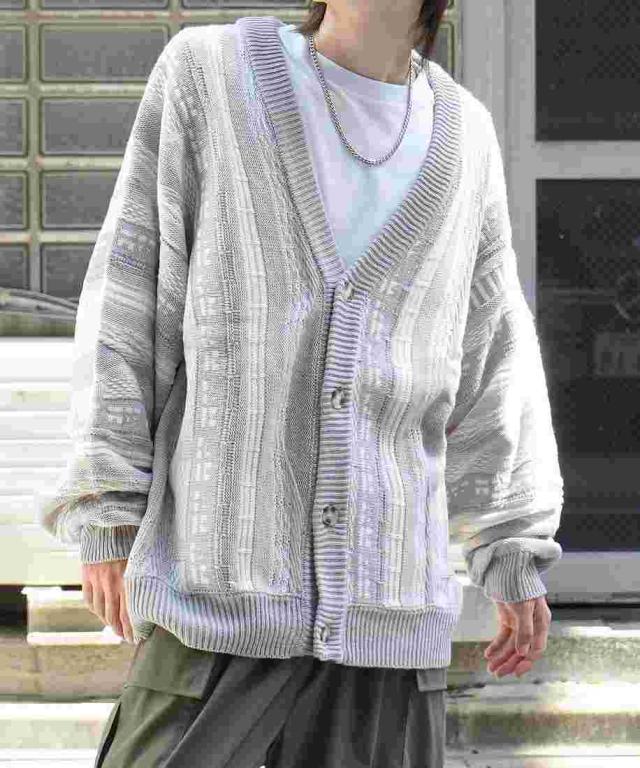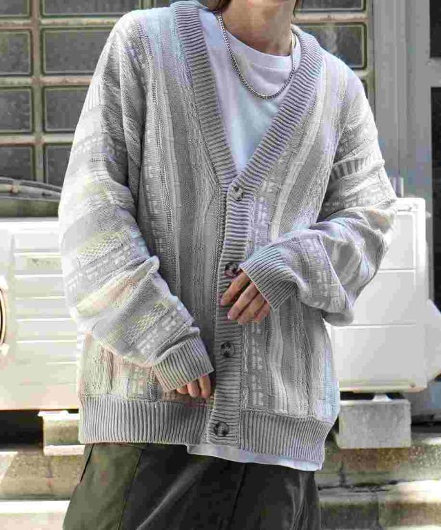Confirm レトロジャガードストライプ柄 ビッグシルエット 3Dニットカーディガン