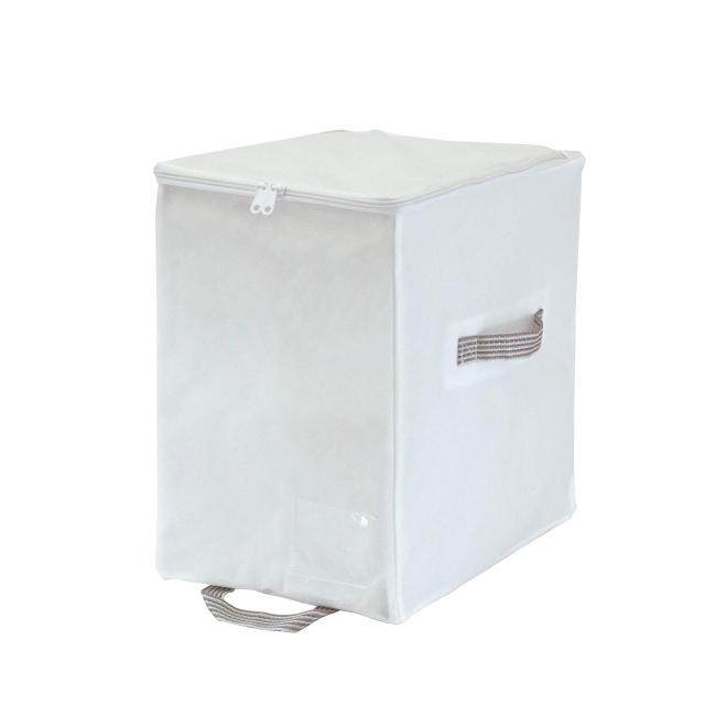 ●棚上収納でシンプル・クローゼットに! 毛布や衣類をスッキリ収納できる収納袋です。 ●引き手が下部について、棚上から引き出しやすいのが特長です。 ●素材は通気性に富むため、カビがつきにくく、保管用として重宝します。 ●収納物がわかるネームホルダー付です。また防虫剤等が入れられるポケットが2ヶ所ついています。 ●収納物は十分乾燥させて、清潔な状態で収納してください。