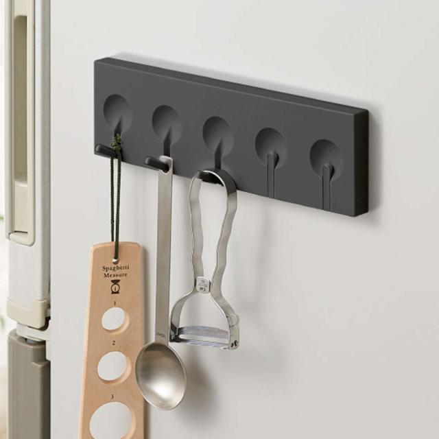 冷蔵庫横やスチール面などマグネットが付く場所に簡単に取り付けられる5連フックです。何度でも取り外し可能で、使いやすい位置に自由に設置できます。