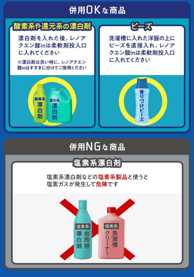 ・さらに柔らかさや香りを足したい時は、まず本品を適正量入れた後に、投入口からあふれない量のレノア柔軟剤を足してください。