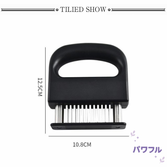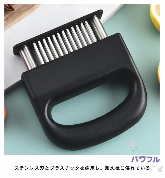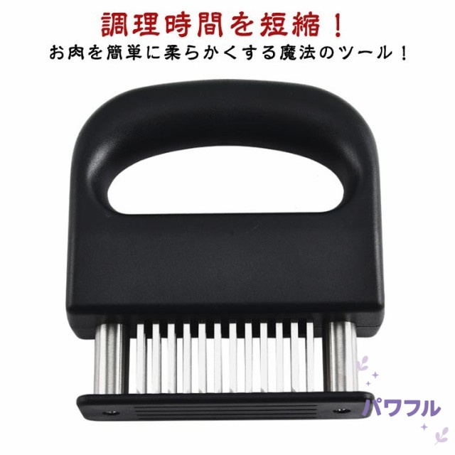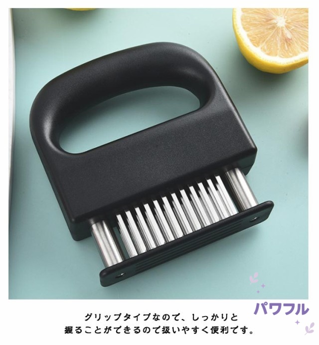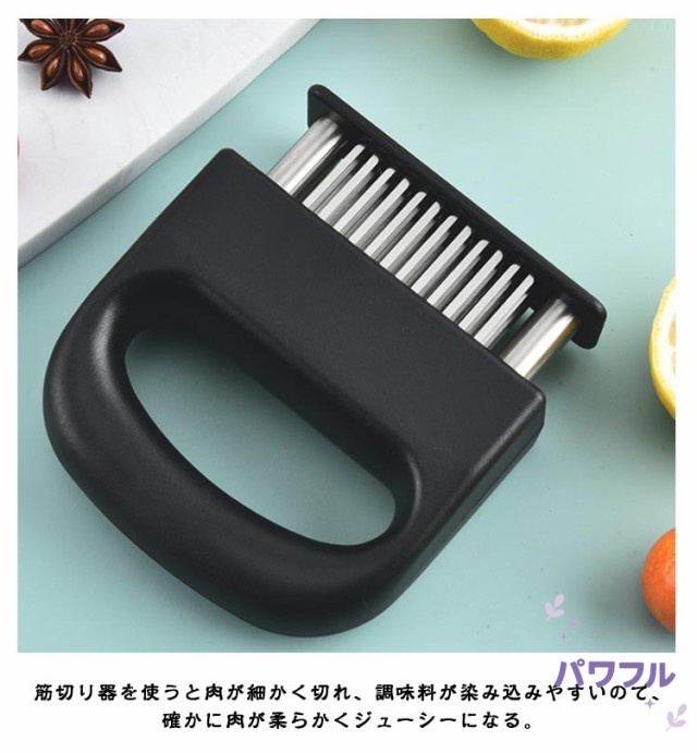| 調理時間を短縮!お肉を簡単に柔らかくする魔法のツール! ステンレス刃とプラスチックを採用し、耐久性に優れている。 筋切り器を使うと肉が細かく切れ、調味料が染み込みやすいので、確かに肉が柔らかくジューシーになる。 特製の48本のステンレス刃が、風味、形を損なうことなくジューシーなお肉に大変身!。 グリップタイプなので、しっかりと握ることができるので扱いやすく便利です。 刃先のカバー部分は取り外すことが出来るので刃のお手入れも簡単です。 牛、豚、羊、鶏等あらゆるお肉のステーキ、焼肉、カツ、シチュー、その他様々な料理にご使用いただけます。 | |