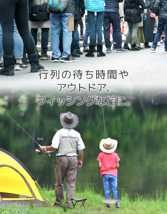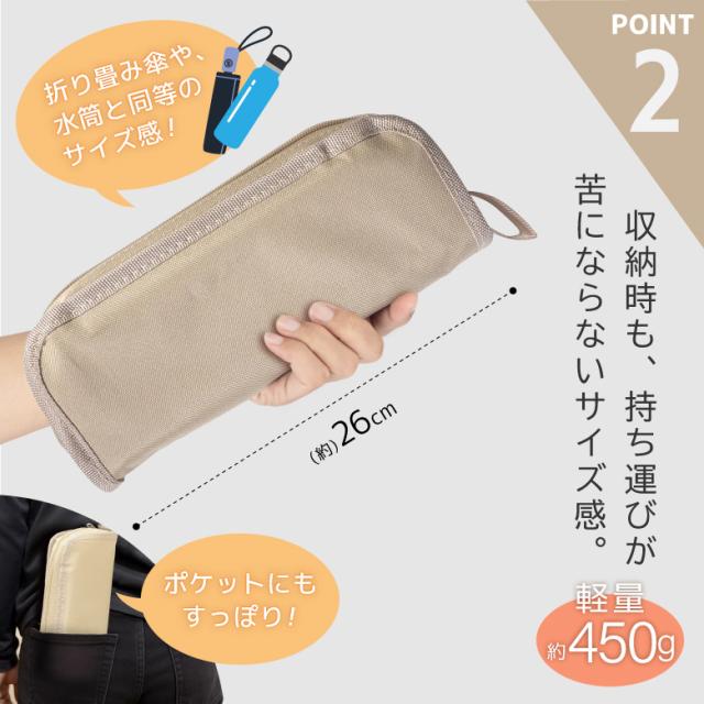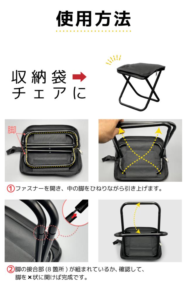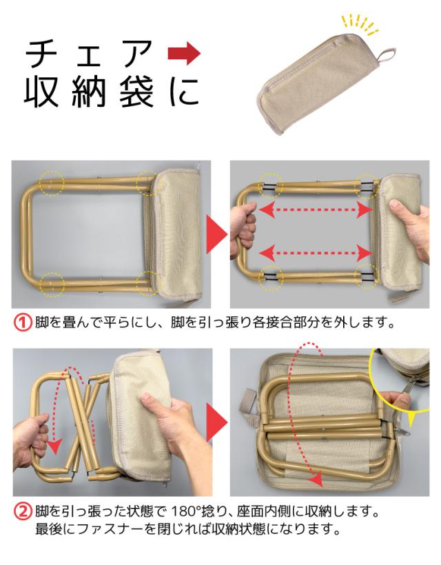 かんたん組み立て&カンタン収納。 収納袋から座椅子にサッと組み立てられます。 収納時のサイズ感は、折りたたみ傘や水筒くらいで持ち運びに便利!