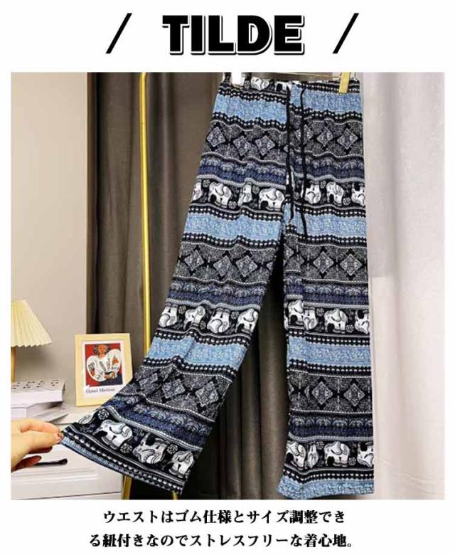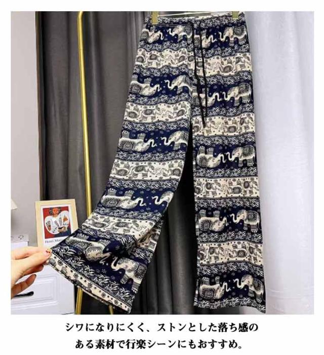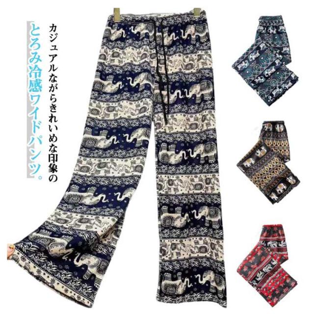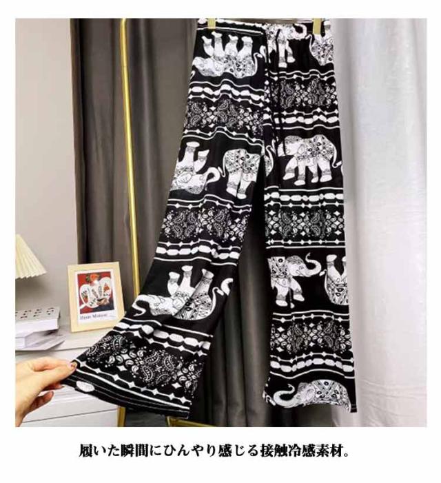 ゾウ柄 ワイドパンツ 2枚セット レディース 総柄 冷感 タイパンツ 2枚セット 涼感 パンツ ワイド ロング 夏 ルームウェア 部屋着 落ち感 接触冷感 通気性 体型カバー ハイウエスト ゴムウエスト ストレッチ パンツ