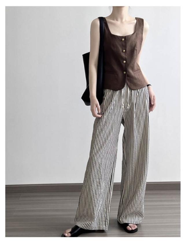 | ゆるっと大人のこなれ感。 ストライプワイドパンツ。 軽い着心地で接触冷感素材のひんやり涼感の肌触りで夏快適! ラインを拾わず体型カバーもでき ウエストゴムの楽な履き心地。 ポケット付きなのも嬉しいポイント シンプルなTシャツコーデも サマ見え間違いなし | |
