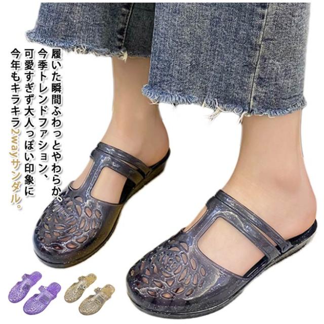 | 履いた瞬間ふわっとやわらか、今季トレンドファション、可愛すぎず大人っぽい印象に今年もキラキラ2wayサンダル。 子どもの送り迎えなどで忙しいママにもおすすめです! カジュアルからキレイめコーディネートまで幅広く使えます。 ラメ入り、爪先からかかとまで柔らかい素材を使用しているので足を優しく包み込んでくれます! 滑りにくい、歩きやすく、長時間履いても疲れにくいです。 ささっと履けて、コンビニなどちょっとお出かけのシーズンでもすぐにキマる。 海やプールに出かけた時にビーチサンダルとしてもオススメ! | |