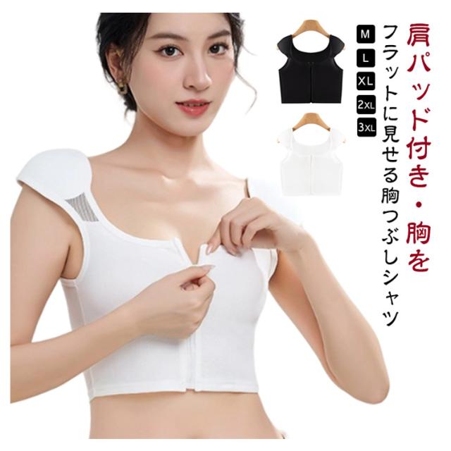 | 肩パッド付き・胸をフラットに見せる胸つぶしシャツ 肩パット付きだから着るだけで肩のラインを綺麗に整えてくれます。肩のラインをシャープに出したい方、なで肩や肩幅が狭いとお悩みの方にもおススメ! 背面はメッシュで通気性がよく、長時間の着用でも蒸れを感じさせない快適な着心地です。 伸縮性もあるので、快適に着用することができます。 着脱のしやすい前開き仕様で、髪の乱れも気にならず着脱スムーズ。 バストを小さく見せたい方、スポーツや運動時揺れ出来るだけ押さえたい方、コスプレや男装される方におすすめします。 | |