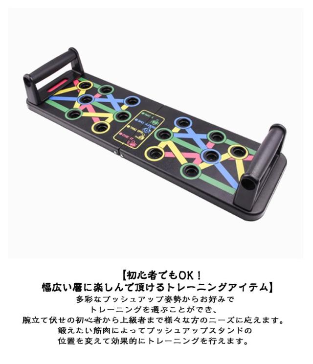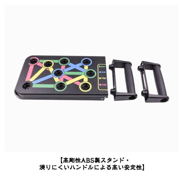 | 自宅で筋肉を鍛えられる! 胸筋/肩広背筋/上腕/三頭筋 理想のボディをつくる プッシュアップバー 【4領域の筋肉を刺激する多彩なトレーニング】 ハンドルの位置を切り替えるだけで、プッシュアップ(腕立て伏せ)によって刺激する筋肉をコントロールできます。 難しい専門知識がなくても、シェイプアップしたい箇所に合わせて効果を出しやすい設計を実現しました。 4つ領域の筋肉を刺激するトレーニング搭載。刺激する筋肉を簡単に切り替えられます。 様々な組み合わせで、退屈せずにトレーニングを行うことができます。 【初心者でもOK!幅広い層に楽しんで頂けるトレーニングアイテム】 多彩なプッシュアップ姿勢からお好みでトレーニングを選ぶことができ、腕立て伏せの初心者から上級者まで様々な方のニーズに応えます。鍛えたい筋肉によってプッシュアップスタンドの位置を変えて効果的にトレーニングを行えます。 腕立て伏せに初めて挑戦する方はやりやすい姿勢からはじめて、フォームを調整しながらトレーニングを開始することをお勧めします。 スキルに自信のある上級者の方は、鍛えたい筋肉を意識しながらターゲットの筋肉に集中して負荷を与えることで、効果的なトレーニングを行っていただけます。 ※トレーニングはご自身の体力・体調に合わせて無理のない範囲で運動を行ってください。 【収納・持ち運びに便利な折りたたみ式デザイン】 軽量なABS素材を採用した折りたたみデザイン採用で、スタンドの収納面積と重量を大幅に削減しています。 ハンドルは取り外し可能で、スタンドの側面にスッキリ収納できます。 平らでしっかりとした床面さえであれば、スタンドを広げるだけですぐトレーニングができます。 ※床への傷の防止、安全性の向上のためトレーニングマットの利用を推奨します。 【高剛性ABS製スタンド・滑りにくいハンドルによる高い安定性】 <高剛性素材> 高剛性と耐久性を実現するために、ABS樹脂製のスタンドとポリアセタール(POM)製のシャフトを採用しました。 頑丈で安定しているため、トレーニング中にバランスを崩す危険性を軽減します。 <ハンドル> ハンドルには滑りにくい素材を採用しており、握りやすい設計です。 ハンドルはスタンド側面の穴に差し込み収納できます。 <安全ロック> 保管時や運搬時にスタンドがばらけてしまうことを防ぐための安全ロック | |