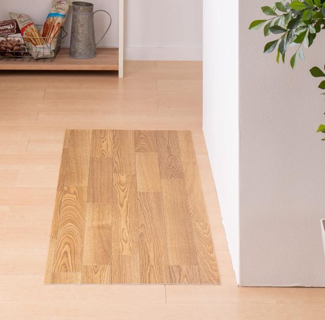表素材は、塩化ビニー ル素材です。食べ物や飲み物をこぼしても、サッと簡単に拭き取ることが出来ます。防炎・抗菌・防カビ機能付きで水をはじくので、キッチンマットとしてもおすすめです。 滑り止めシール付きでズレ防止も安心です。