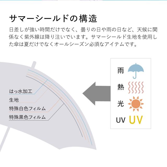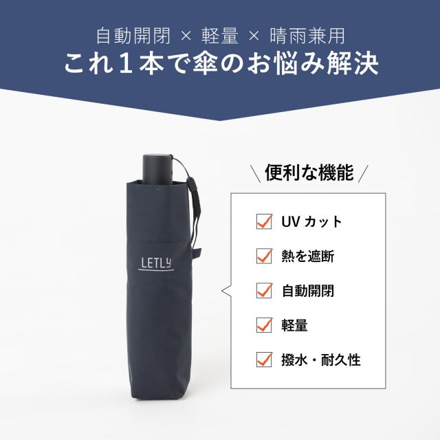 畳みにくい、重たくて運びにくい、熱を通して暑い、晴雨兼用の傘が欲しい。その傘の悩みをLETLY(レトリー)の日傘がで解決します。熱を遮断し、UVカットで暑い日も快適に過ごせ、自動開閉で簡単に使え、軽量で持ち運び安く、撥水・耐久性も兼ね備えています。東レのサマーシールドを使用し、紫外線や赤外線を反射、特殊なコーティーングで、99%以上のUVカットを実現し、ワンランク上の紫外線対策ができます。遮熱性も優れており、サマーシールドが太陽の熱を反射・遮断してくれるので、体感温度-4度以上下がり、日陰にいるような涼しさに。真夏の外出でも、快適に楽しめる全天候型の傘です。ワンタッチの自動開閉で、収納もスムーズにでき、スマホ並みの軽量設計で持ち運びも楽にてきます。細くて丈夫なグラスファイバー骨で、安心の使い心地。留め具も太めのバンドで留めやすく、スリムな持ち手は手になじみ、スマートに収納できます。
