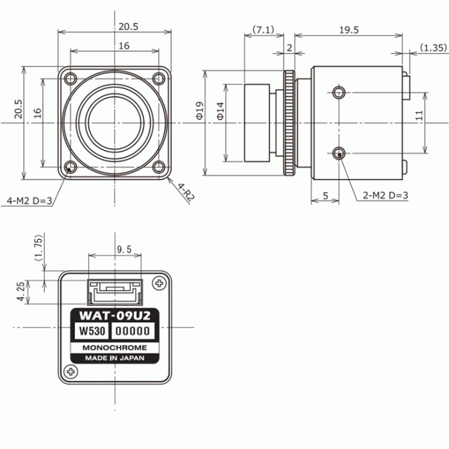 ■ WAT-09U2(G3.6) | 1/2.8型 超小型USB2.0フルHDモノクロカメラ