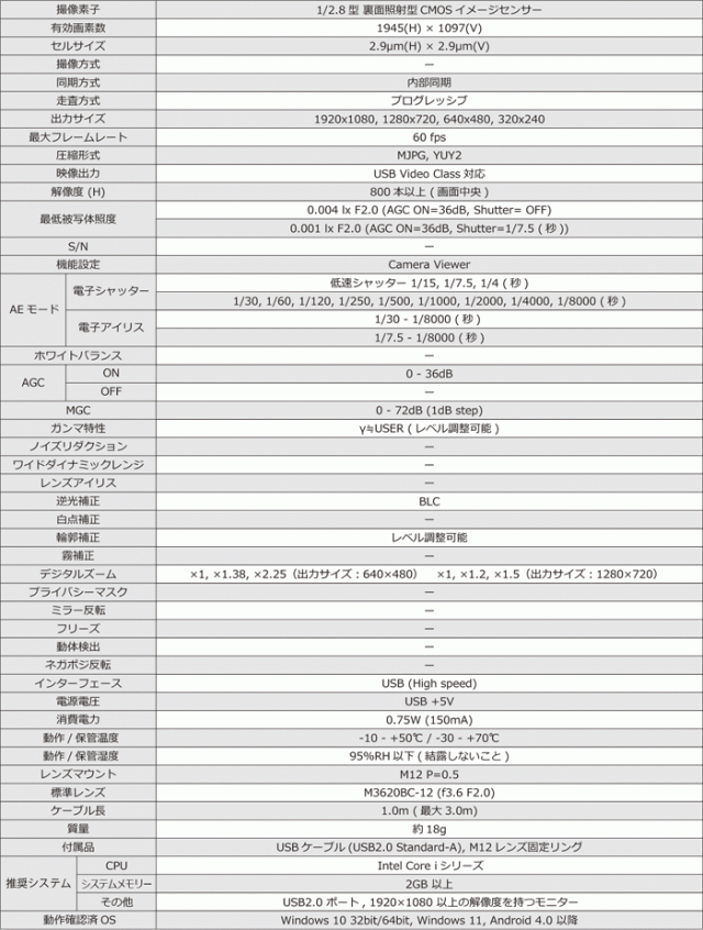 ・仕様及びデザインは予告なく変更される場合がございます。予めご了承ください。1/2.8型 超小型 USB2.0 フルHDモノクロカメラ