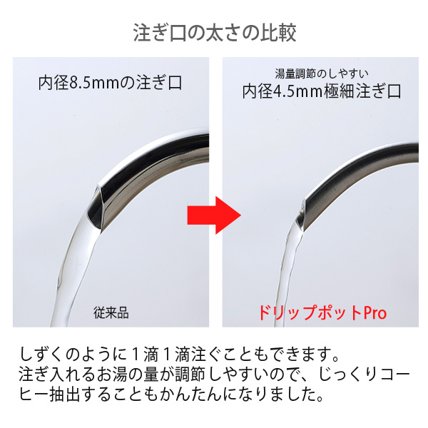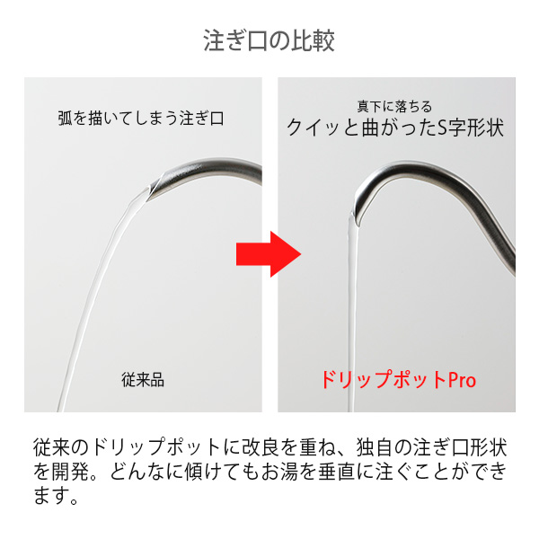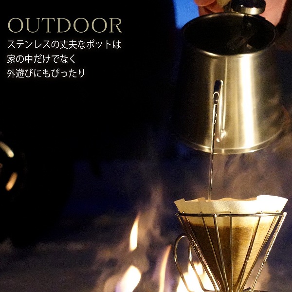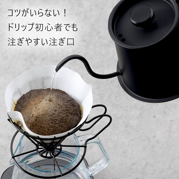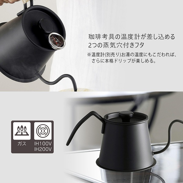 - 細口のドリップケトルをいろいろ探していてこちらの商品に辿り着きました。 蓋が付いていてIH対応のヤカンとしても使える点が購入の決め手になりました。単に移し替えをするタイプのケトルより幅広い用途で使えそうです。お湯が真下に落ちるのも商品説明の通りでした。 細かい部分では、蓋がパチンと閉まることや、置いた時に設置面が安定して見える点、取手が熱くならずフックに掛けられる点、マットな質感などが個人的に気に入っています。少し高かったけれど買って良かったと思いました。