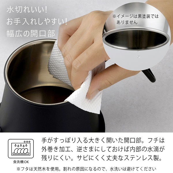 漆黒のツードリップポット!どんなに傾けてもほぼ垂直に注げるこだわりの注ぎ口角度。極細口で一滴湯量に調整可能。手を入れて洗える口径、フチは外巻き加工にすることで、使用後の水切れも良くなりました。フタに蒸気穴が2つ付いています。1つの穴に珈琲考具の温度計を入れて使用できます。フタが注ぎ中に落ちないように、フタのフチに突起を付けました。つまみは天然木を使用しています。