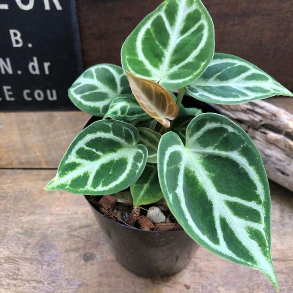 その名の通りまん丸な形で、ベルベットの様な光沢の葉と銀白色の葉脈が美しい品種です。一花ではなく、美しい葉を楽しむ観葉植物の原種アンスリウムです。株ごとに微妙に異なる美しい葉脈入りの葉がなんとも魅力的です。