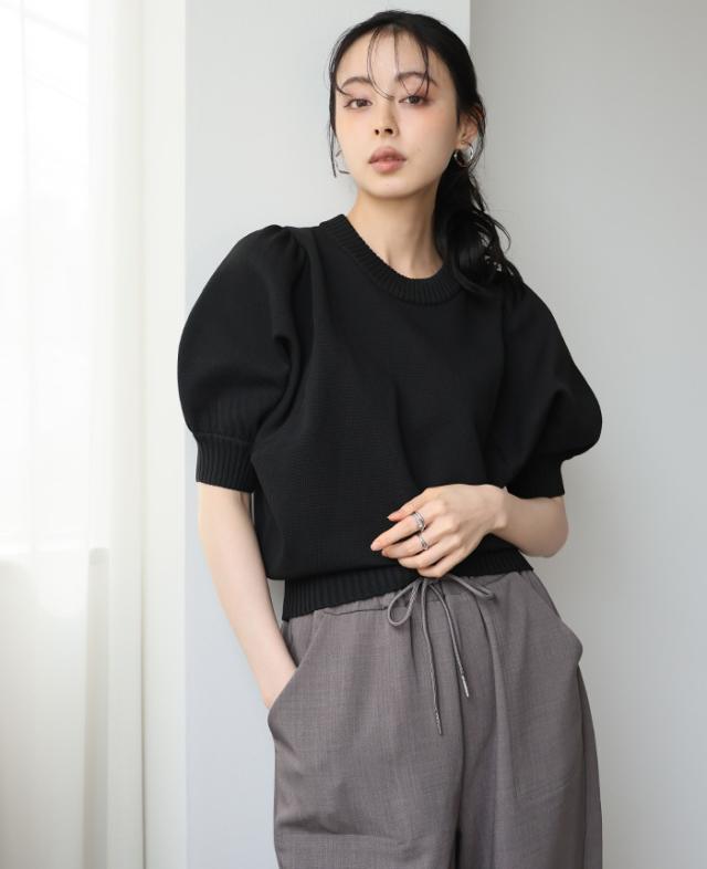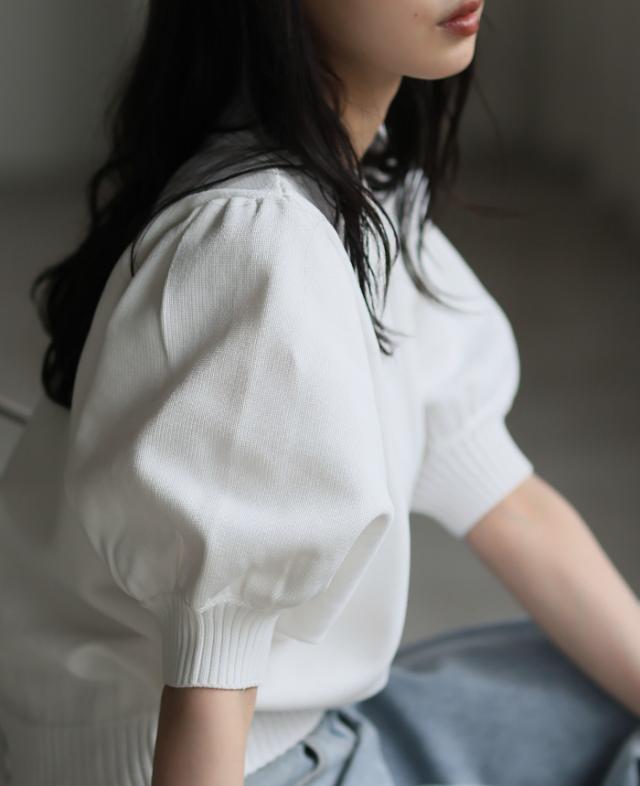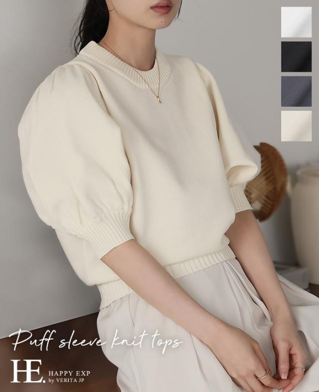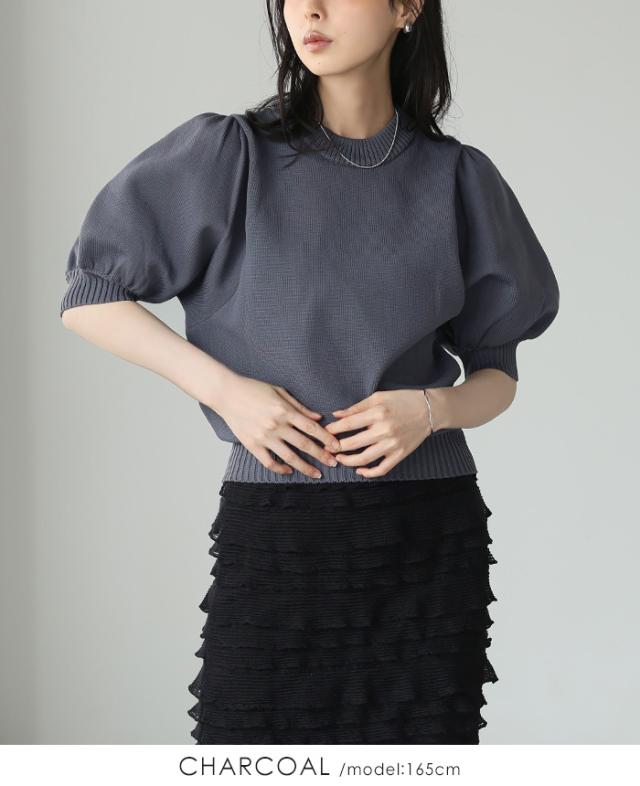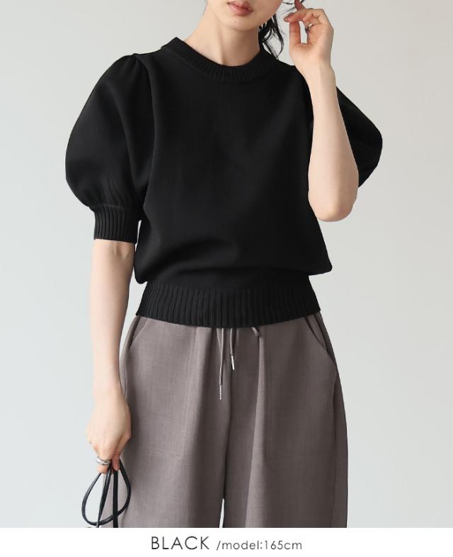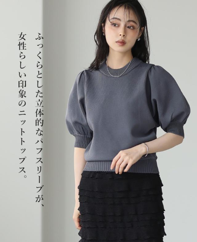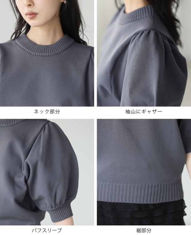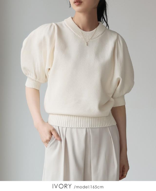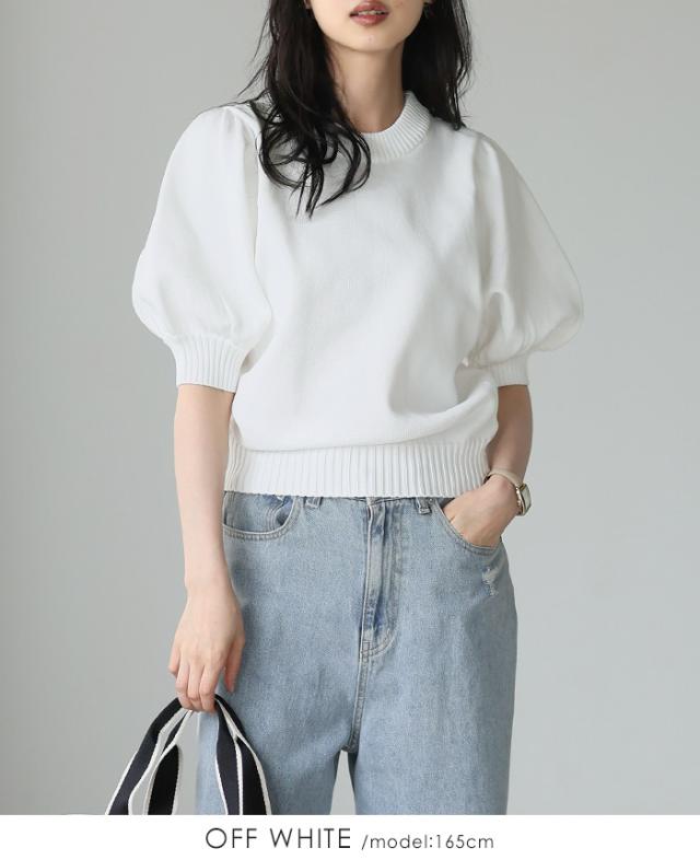 パフスリーブ半袖ニットトップス セーター スポンジニット ボリューム袖 レディース プルオーバー スタイルアップ ショート丈【メール便不可】