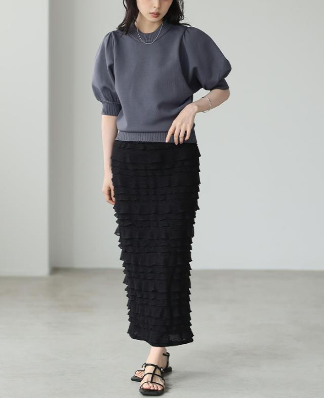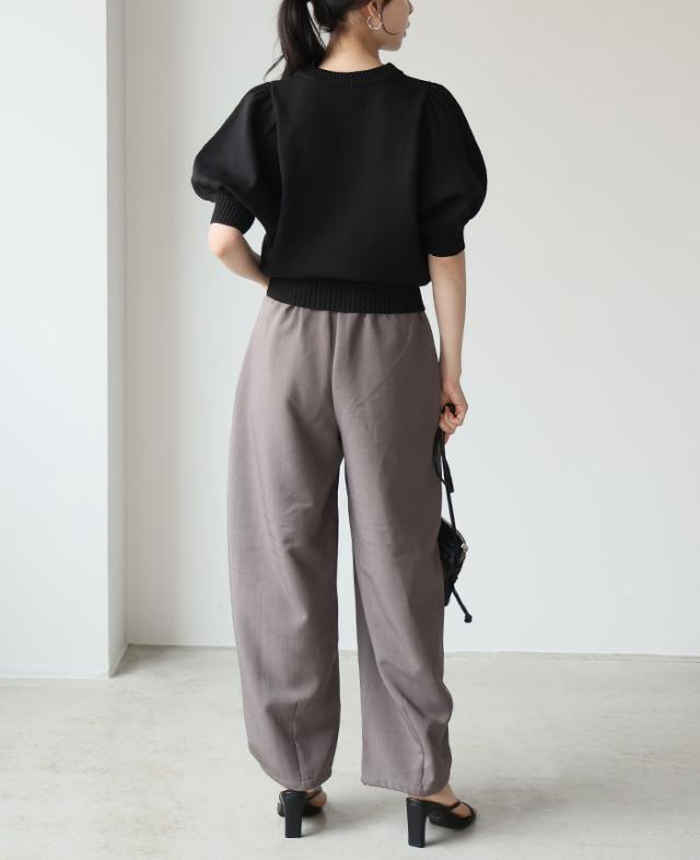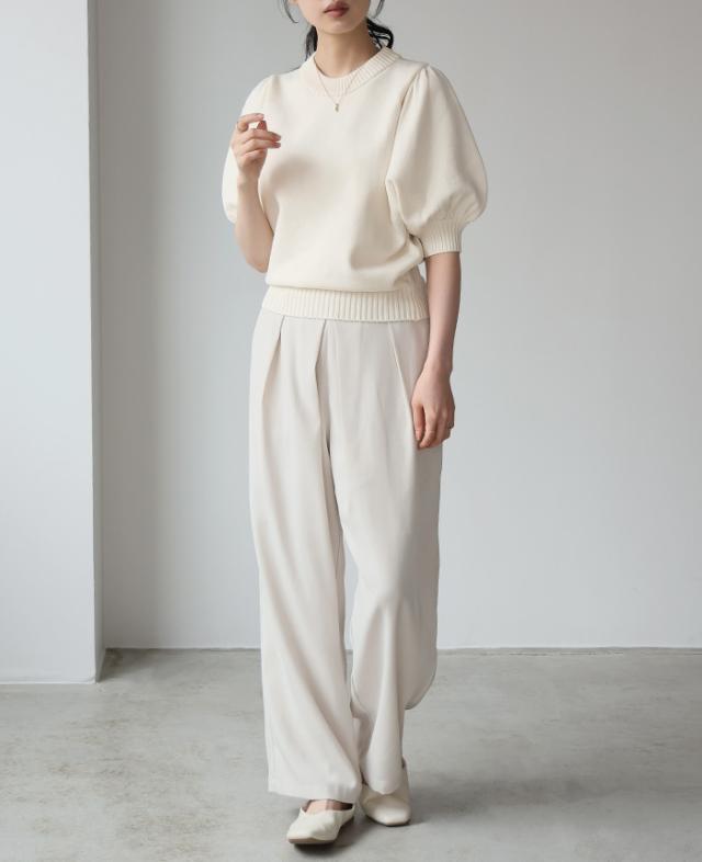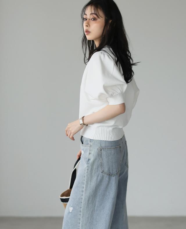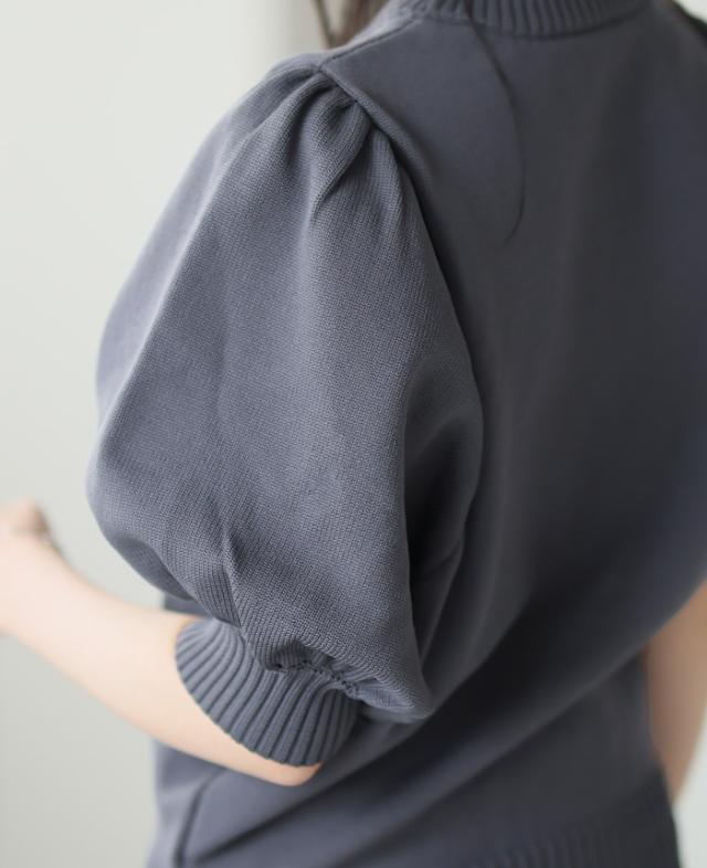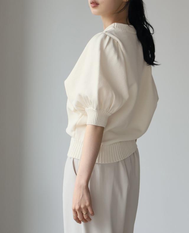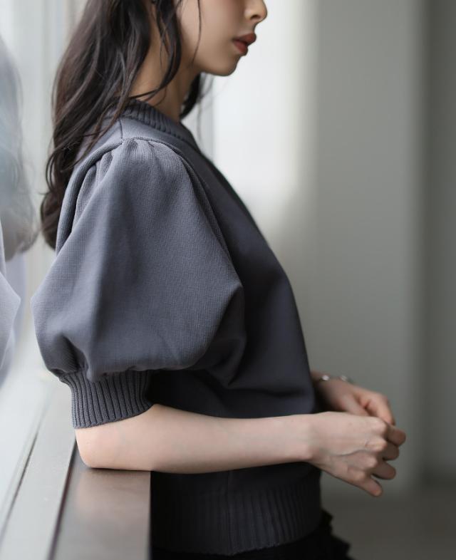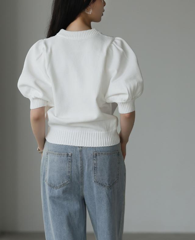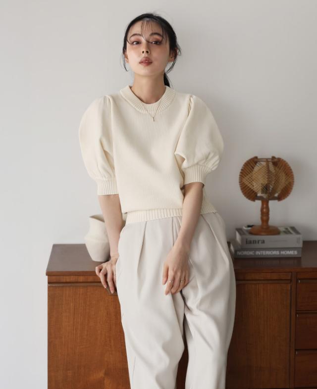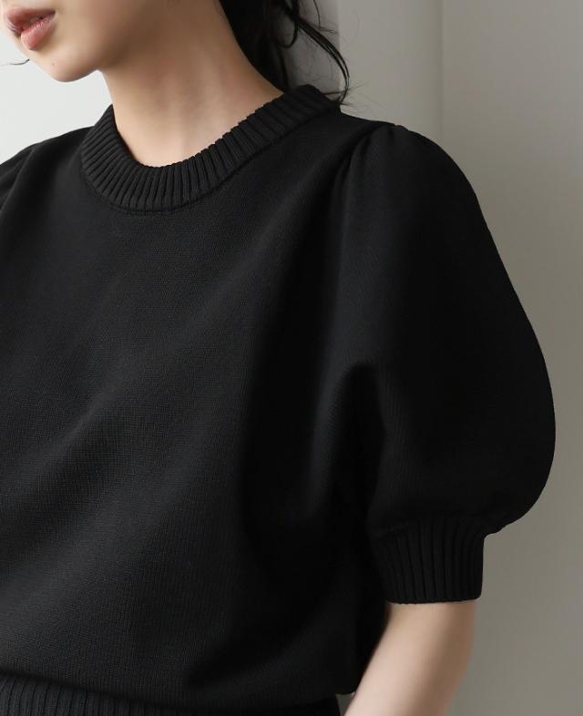 パフスリーブ半袖ニットトップス セーター スポンジニット ボリューム袖 レディース プルオーバー スタイルアップ ショート丈【メール便不可】