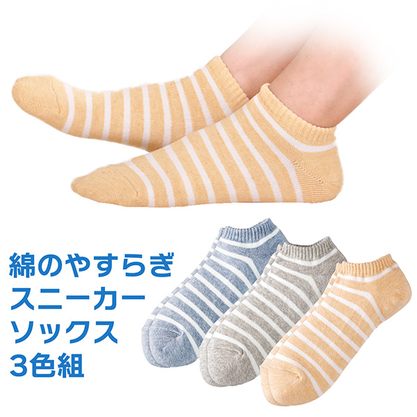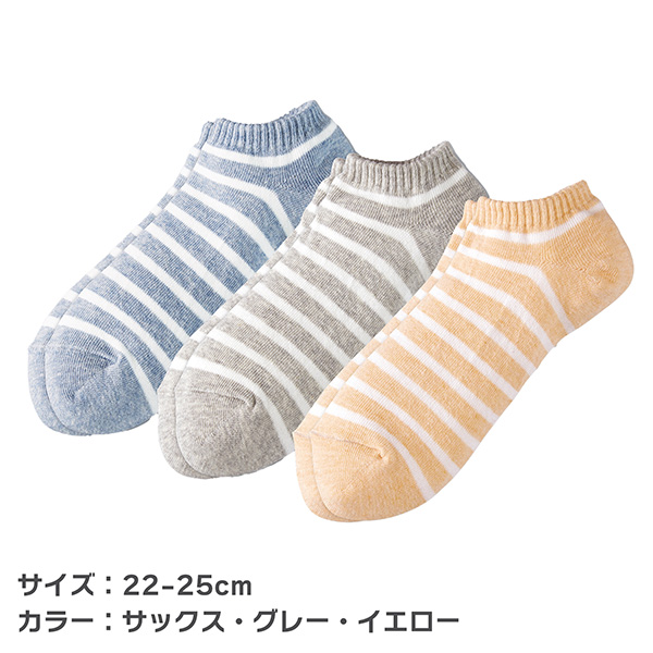 【3足組】綿のやすらぎスニーカーソックス 3色組 2126030 スニーカー丈 ボーダーソックス ショート丈 スニーカー靴下 コットンソックス 靴下 22-25cm 三笠 MIKASA