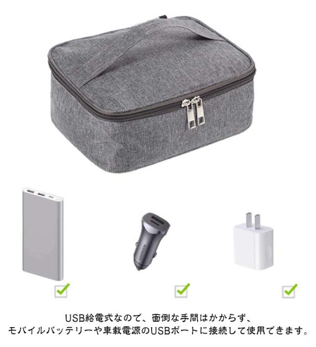 | 暖かい食べ物をいつでもどこでも楽しめるランチバッグ USB式 ランチバッグ。 バッグ内にヒーターが内蔵されています。いつでもどこでも暖かくて美味しい物を食べます。 電熱保温バッグはお弁当だけではなく、缶コーヒーなどの飲み物を入れることもできます。 外側は撥水加工したオックスフォード、内側は断熱アルミシートを採用し、汚れても濡れてもサッと拭くだけでキレイになります。 保冷剤を入れて保冷バッグとしての利用も可能です。耐磨耗や耐久性や防水性に優れます。お弁当の美味しさを保ってくれます。 USB給電式なので、面倒な手間はかからず、や車載電源のUSBポートに接続して使用できます。 | |