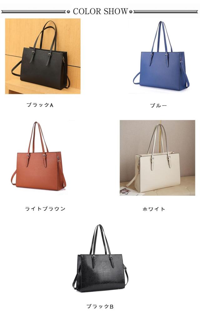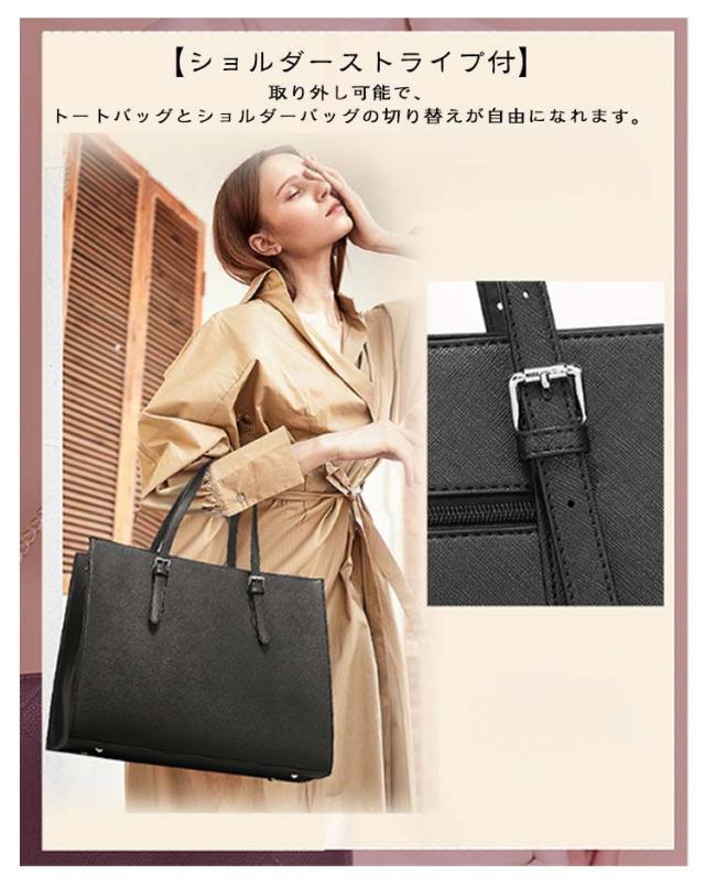 | リクルートに最適!機能的にもデザイン的にも優れたビジネスバッグ 【ビジネスにリクルートに】 ビジネスバッグとして、リクルートバッグや就活バッグ、就職活動に最適です。 【自立機能】バッグの底に鋲が4つ付いております。直置きでも傷や汚れからバッグを守ります。しっかりとした作りですので自立し倒れる心配もありません 【収納力抜群】A4サイズも入る大容量。財布、手帳、スマートフォン、書類、折り畳み傘、雑誌、化粧品など必要な物がたくさん収納可能。15.6インチのノートパソコン、タブレットやA4サイズの雑誌、書類も入ります。 【ショルダーストライプ付】取り外し可能で、トートバッグとショルダーバッグの切り替えが自由になれます。 【持ち手を3段階に調整】使いやすいサイズで持ち手の長さを3段階に調整可能です。 【防水性】生地は防水PUレザー生地を使用しており、外出時に雨が降っていたとしても、中の資料が濡れる心配は要りません。 【適用シーン】どんな場合でも、 バッグはシャツ、洋服、リクルート スーツ、ビジネス、カジュアルなどと相性しますよ! | |